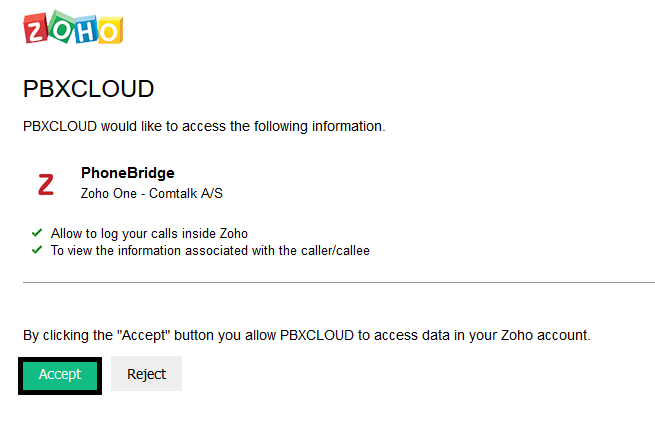 4. Click “Accept” to allow PBXCLOUD accessing your Zoho account.