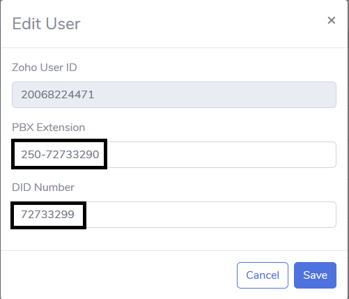 For every Zoho User add a unique PBXCLOUD extension and DID