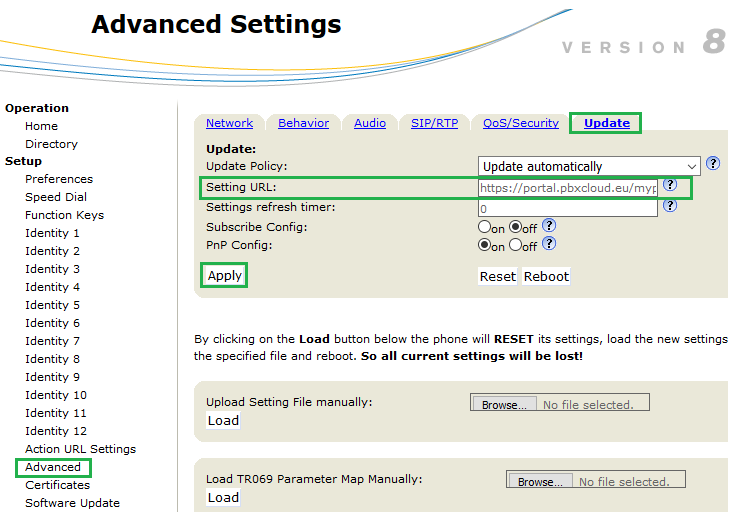 SNOM Telefoner kan provisioneres direkte til PBXCLOUD. Er det ikke muligt at lave en auto-provisionering, kan det gøres manuelt ved at indsætte en provisionerings URL adresse i telefonens webinterface.