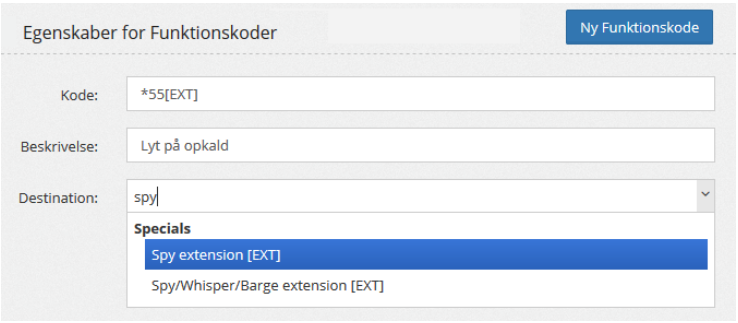 Giver mulighed for at lytte live ind på andre extensions på PBX systemet. ønsker man at lytte til extension 200, bruges funktionskoden ved at ringe *55200.